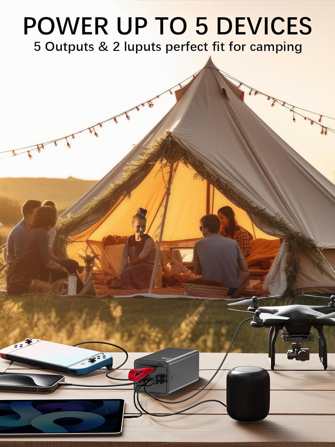 This 90000mAh portable charger supports 5 devices, ideal for travel and outdoor activities. Not allowed on planes.