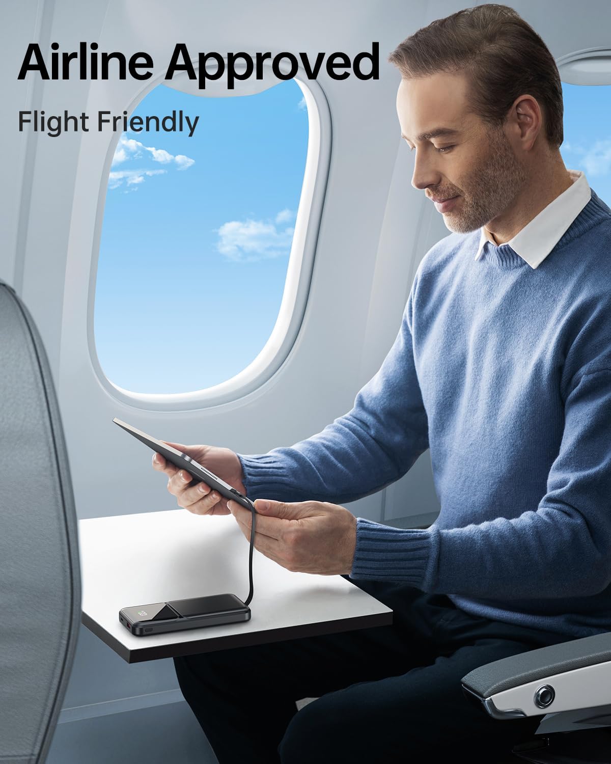 Slim 20000mAh power bank with 4 built-in cables; fast charging, 5 outputs, and LED display for travel convenience. Airline-approved.
