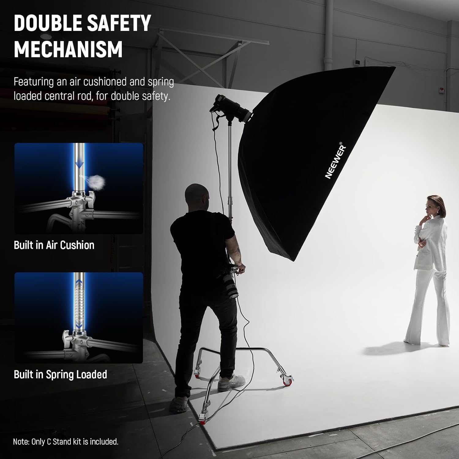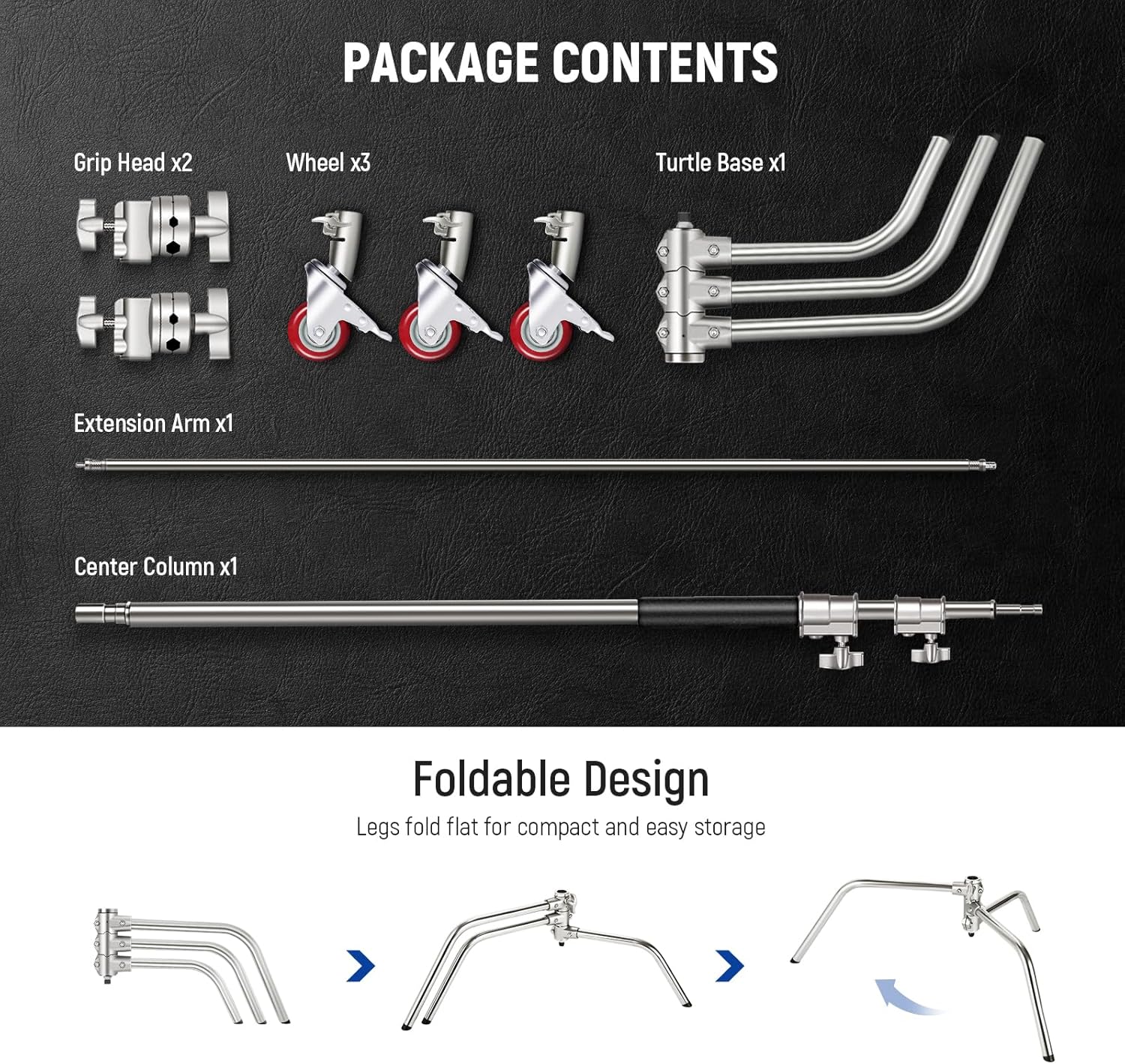 With an impressive height adjustment, solid build, and functional design, the NEEWER Professional C Stand is a strong choice for photographers looking to enhance their studio setup or on-location shoots.
