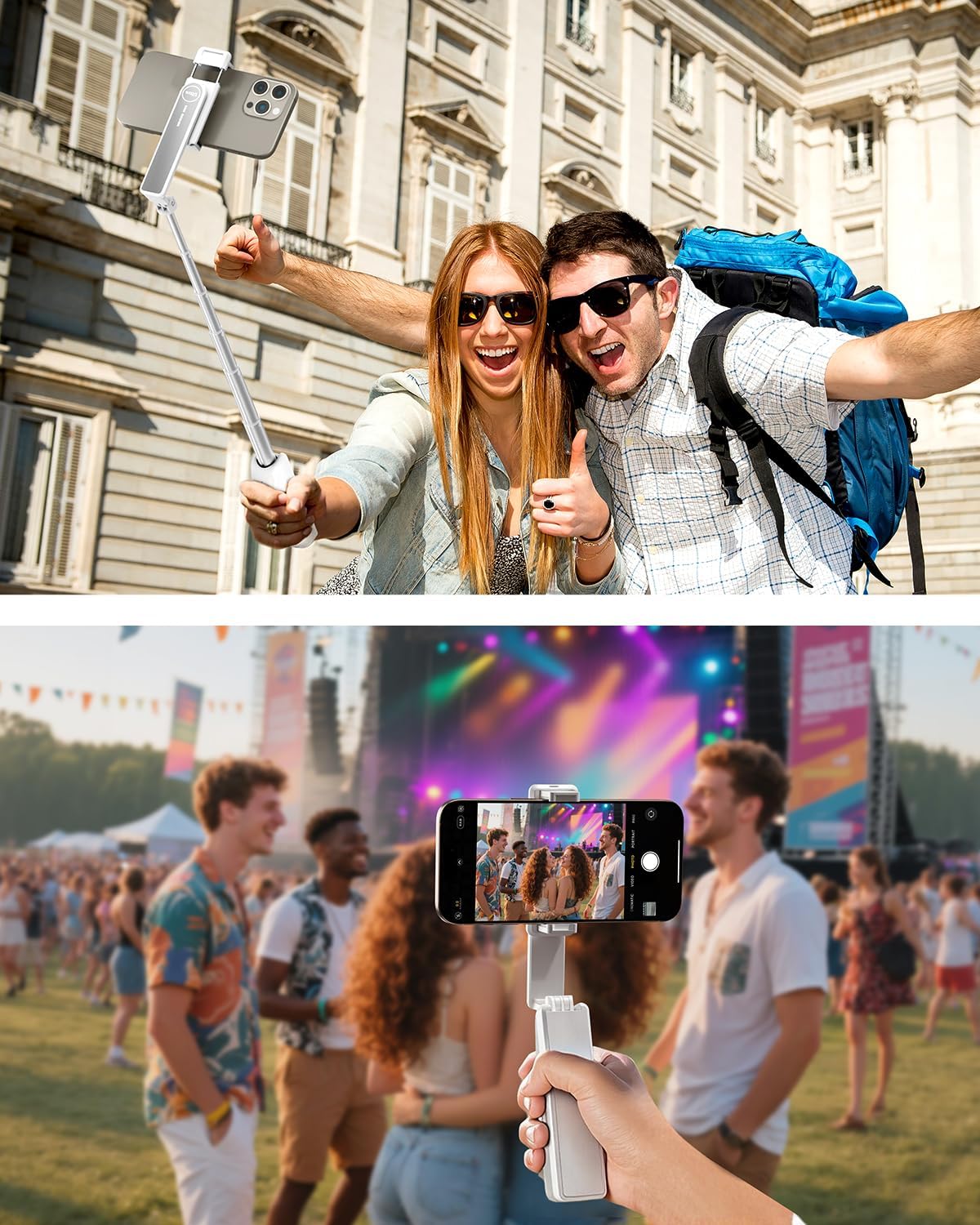 Featuring a built-in Bluetooth control, this selfie stick allows you to snap photos and videos instantly with just one click. No extra apps are required—simply pair your phone and shoot away!