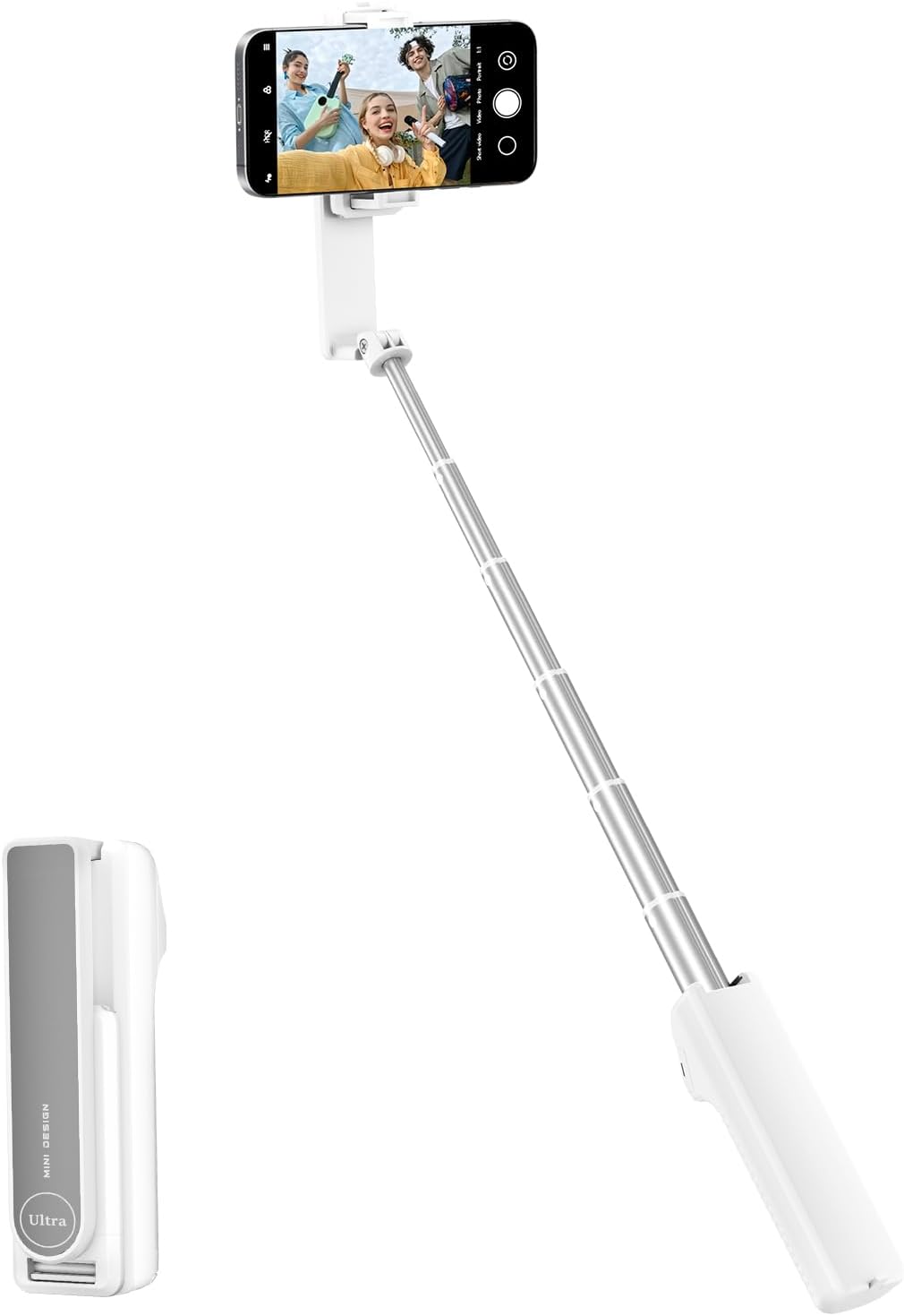 Ultra-compact selfie stick with Bluetooth remote; perfect for travel, easy to use, and compatible with all smartphones.