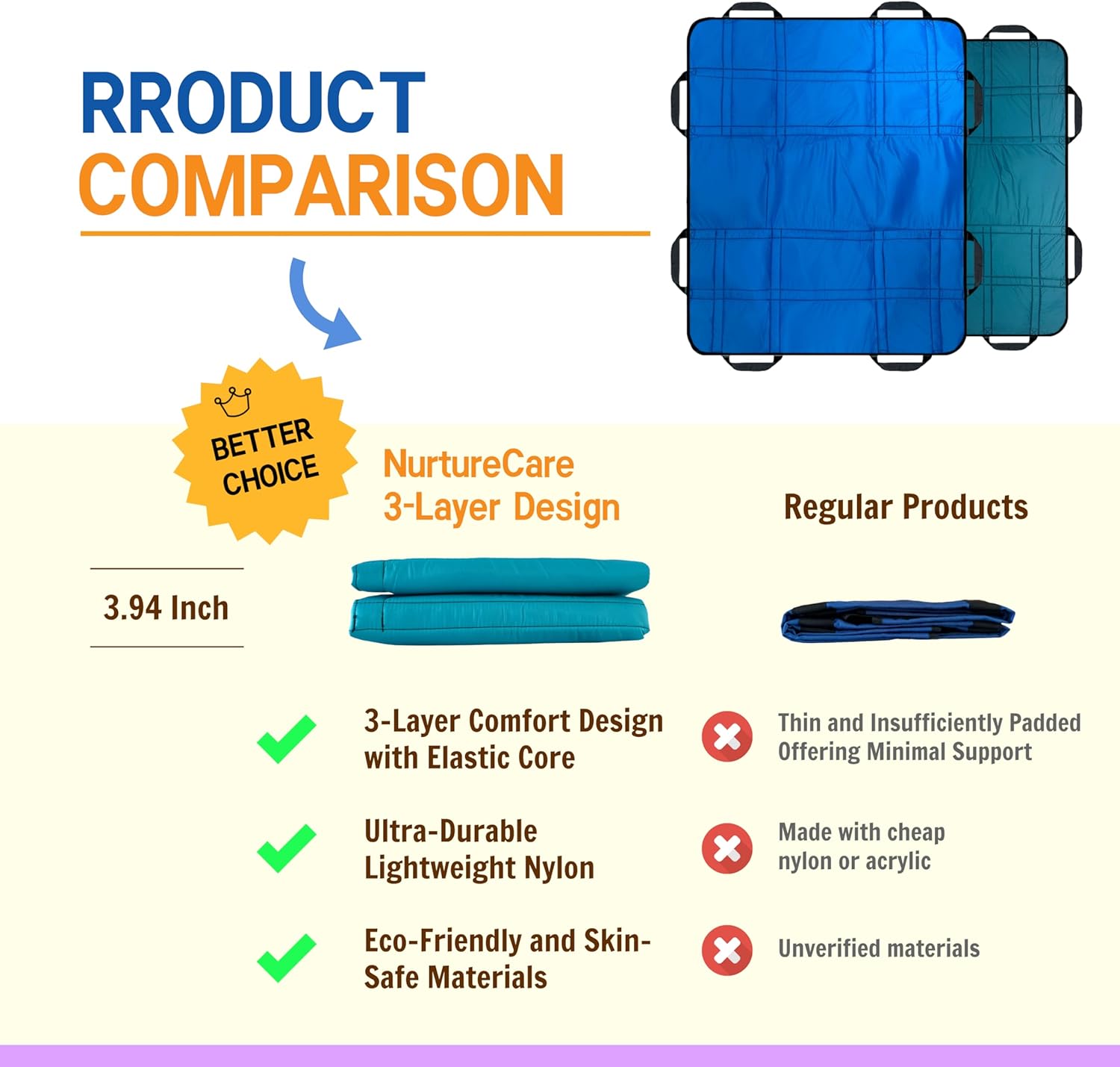 The NurtureCare Positioning Bed Pad is designed to enhance comfort and facilitate easy transfers for those in need of caregiving support. It features a 3-layer construction that provides durability, waterproof protection, and breathability, making it an ideal choice for bedridden patients.