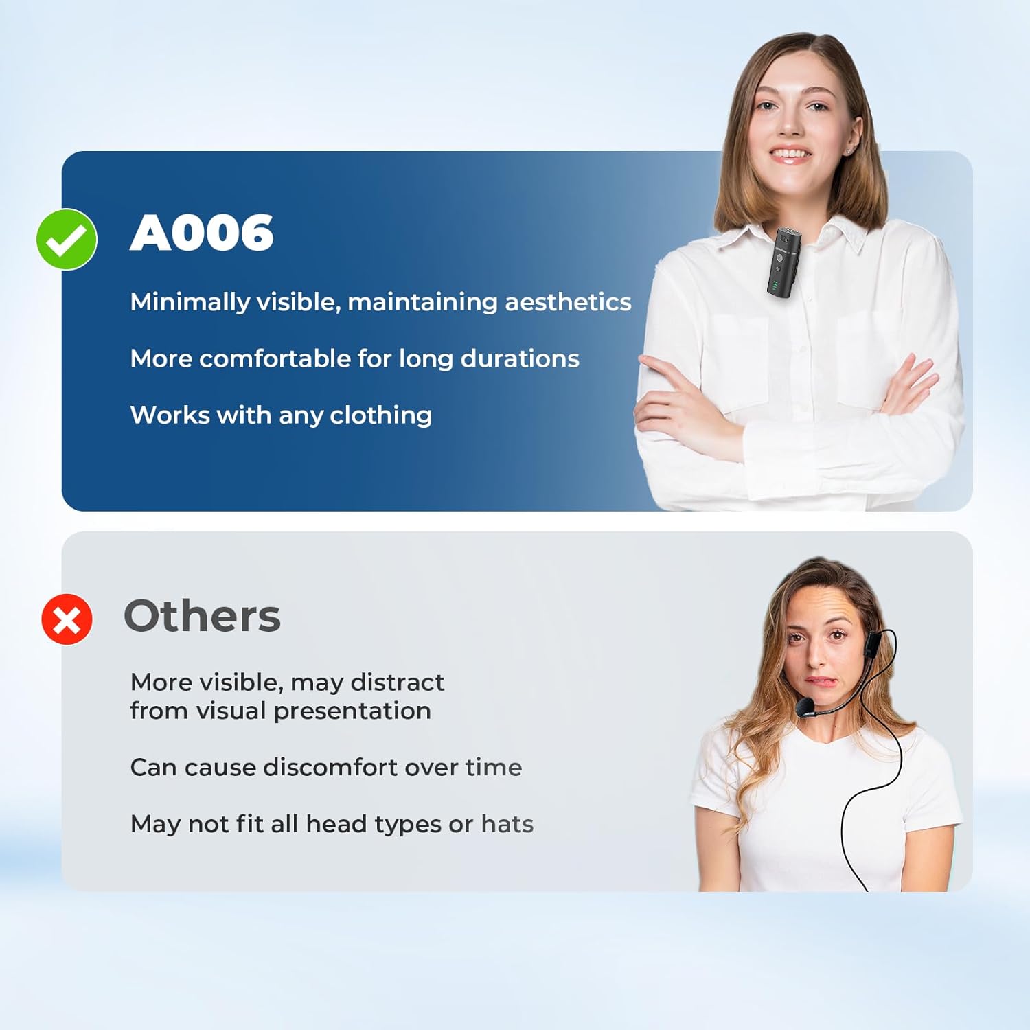 Speak clearly all day. Lightweight mic is easy to wear and always audible