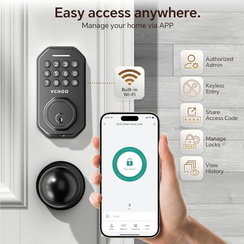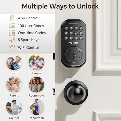 4 in 1 Keyless Entry Door Lock: VCHOO door locks for front door supports multiple ways to unlock: App Control, 100 user codes, one-time code, 5 physics keys. Keypad door lock with handle play an important role in self-housing, offices, rental property management, hotels.