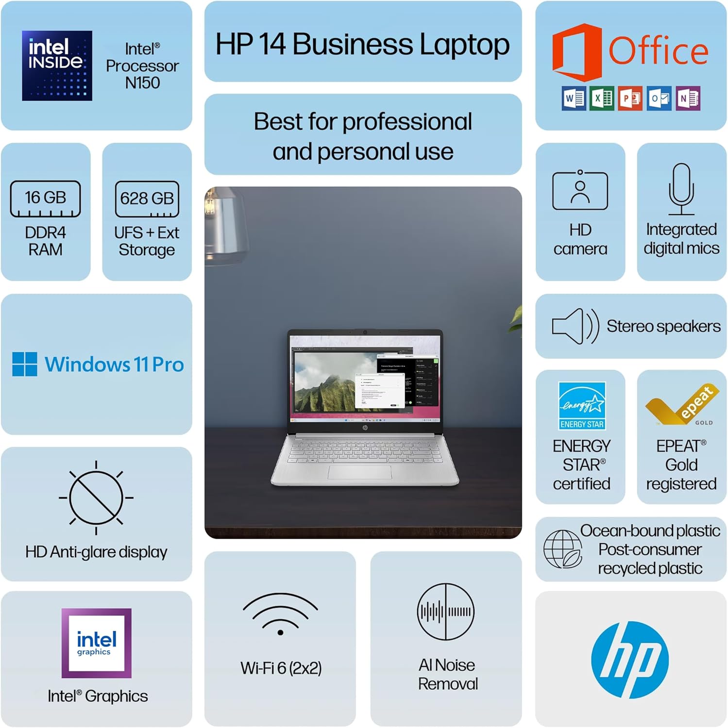 Specification: HP 14” Flagship Laptop 2025 AI-Powered Computer, Office Lifetime, Student Business, 4-Core Intel CPU, 16GB RAM 628GB Storage (128GB UFS+ 500GB Ext), Long Battery HubxcelAccessory Win 11 Pro Silver