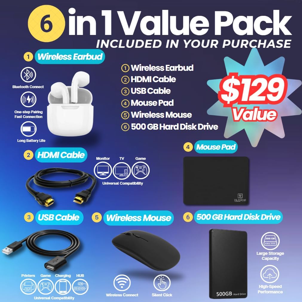 With the latest Wi-Fi 6 and Bluetooth 5.4 technology, connectivity is seamless. The variety of ports ensures compatibility with numerous devices. Plus, the inclusion of a 6-in-1 HubxcelAccessory (wireless earbuds, 500GB external drive, USB extension cord, HDMI cable, mouse pad, and wireless mouse) enhances usability further.