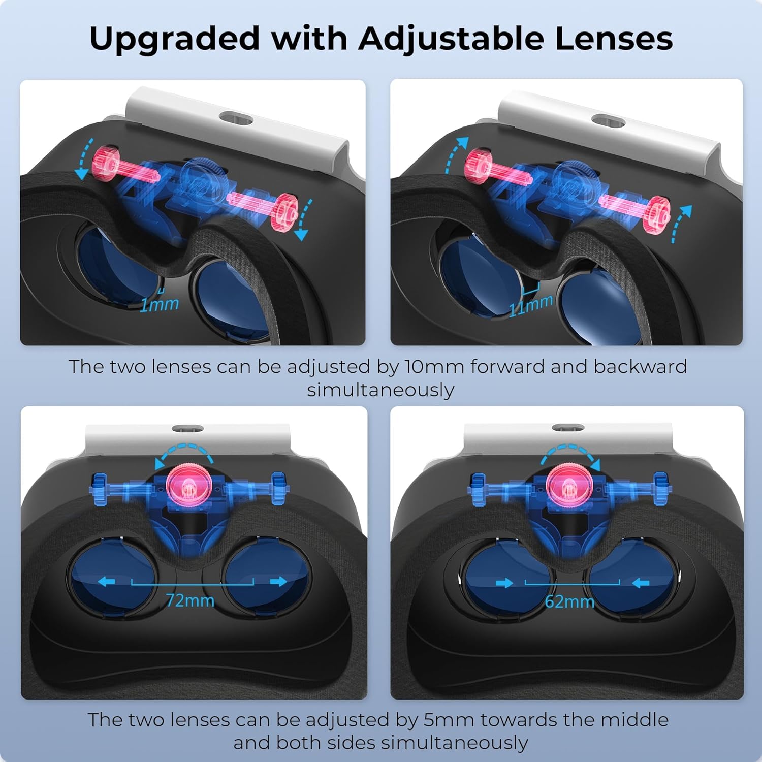 - Adjustable HD Lenses: The headset includes wide-range, high-definition lenses that can be adjusted in multiple directions to accommodate users with nearsightedness. The fog-resistant design ensures uninterrupted gameplay.