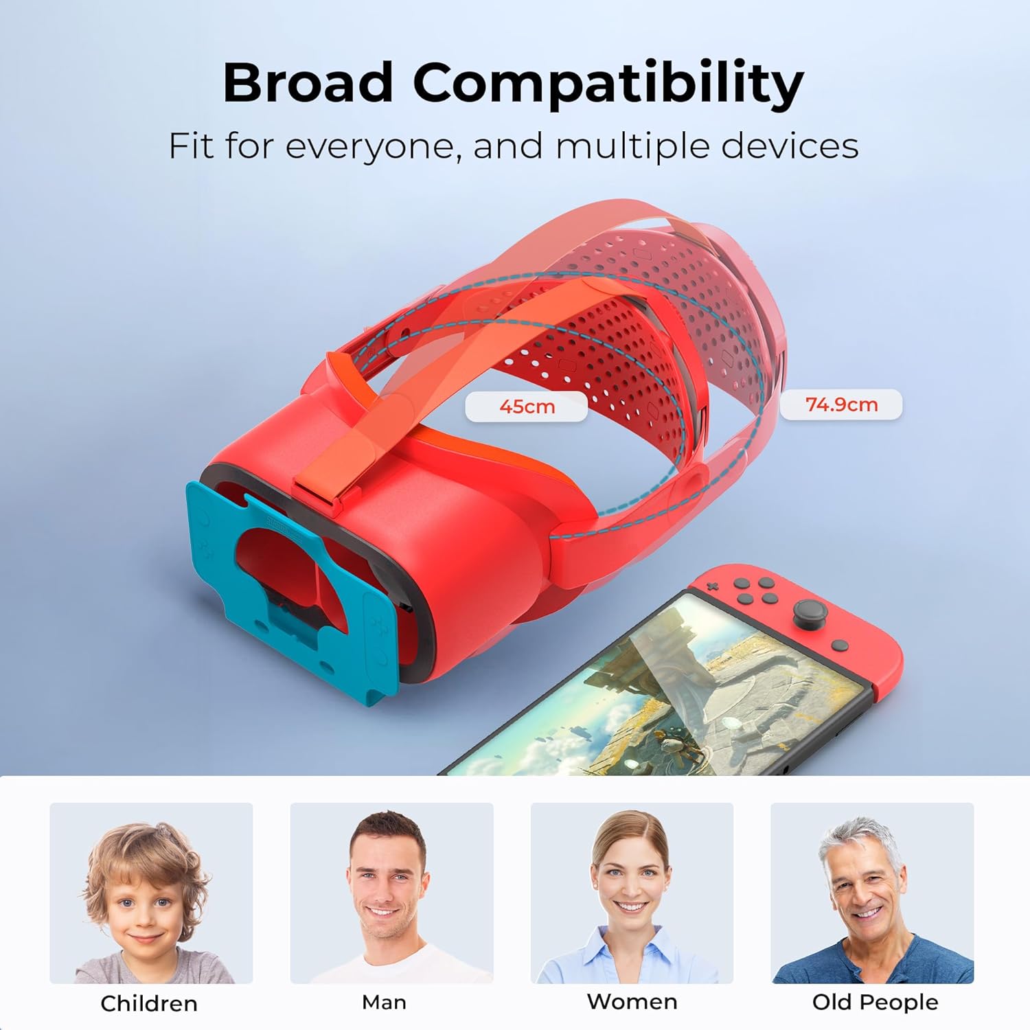 The VR Headset with Head Strap is designed for both the original Nintendo Switch and the Switch OLED models. It offers an immersive gaming experience tailored for fans of popular titles like Super Mario Odyssey and The Legend of Zelda: Breath of the Wild.