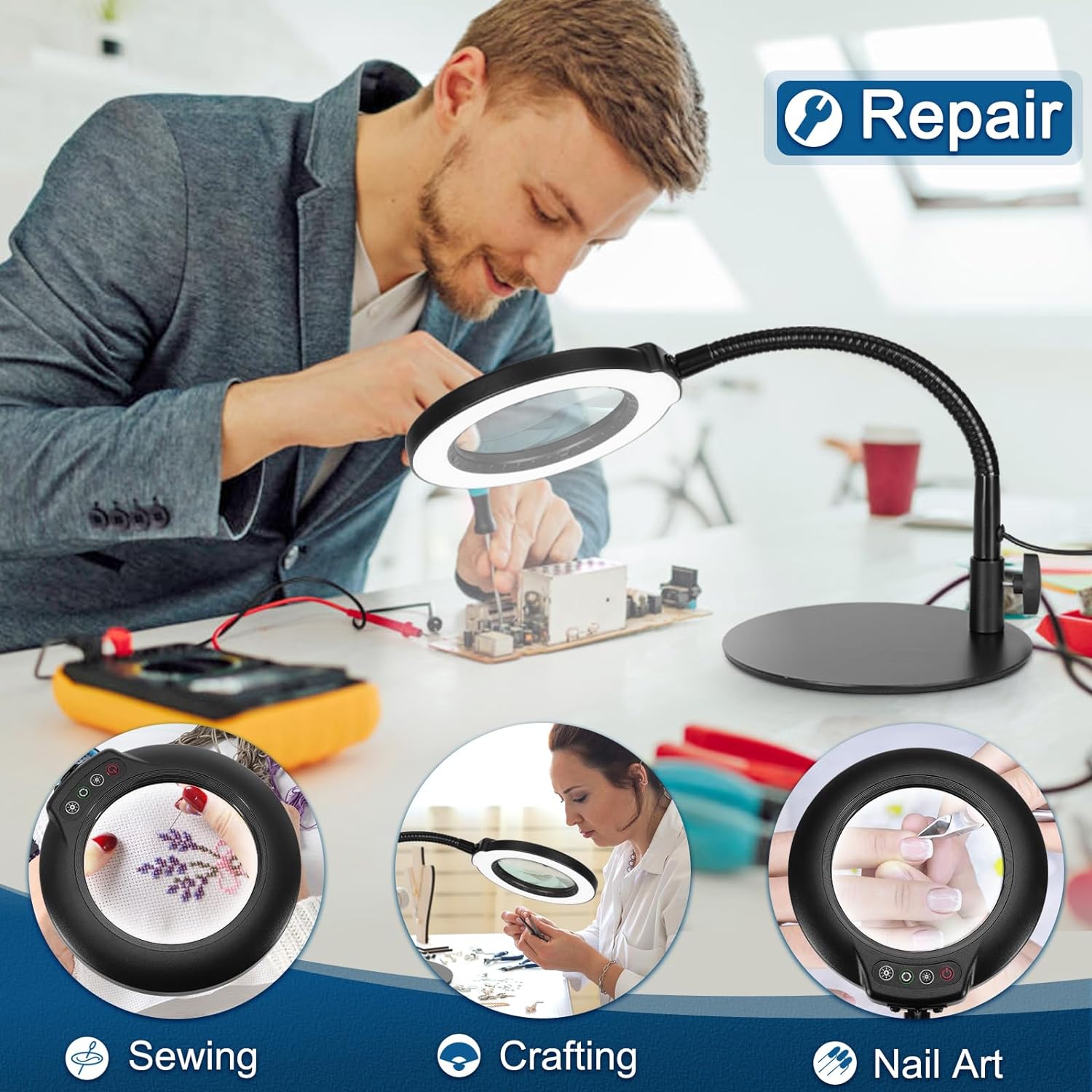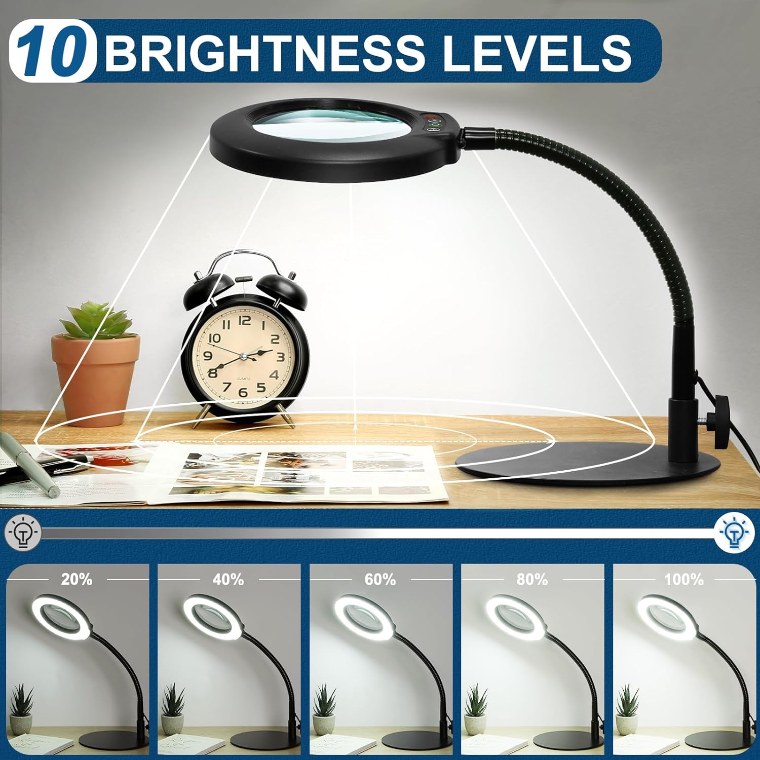 Featuring a 12.6-inch flexible gooseneck and a reinforced heavy base, this desk magnifier ensures stability and easy maneuverability for hands-free use.