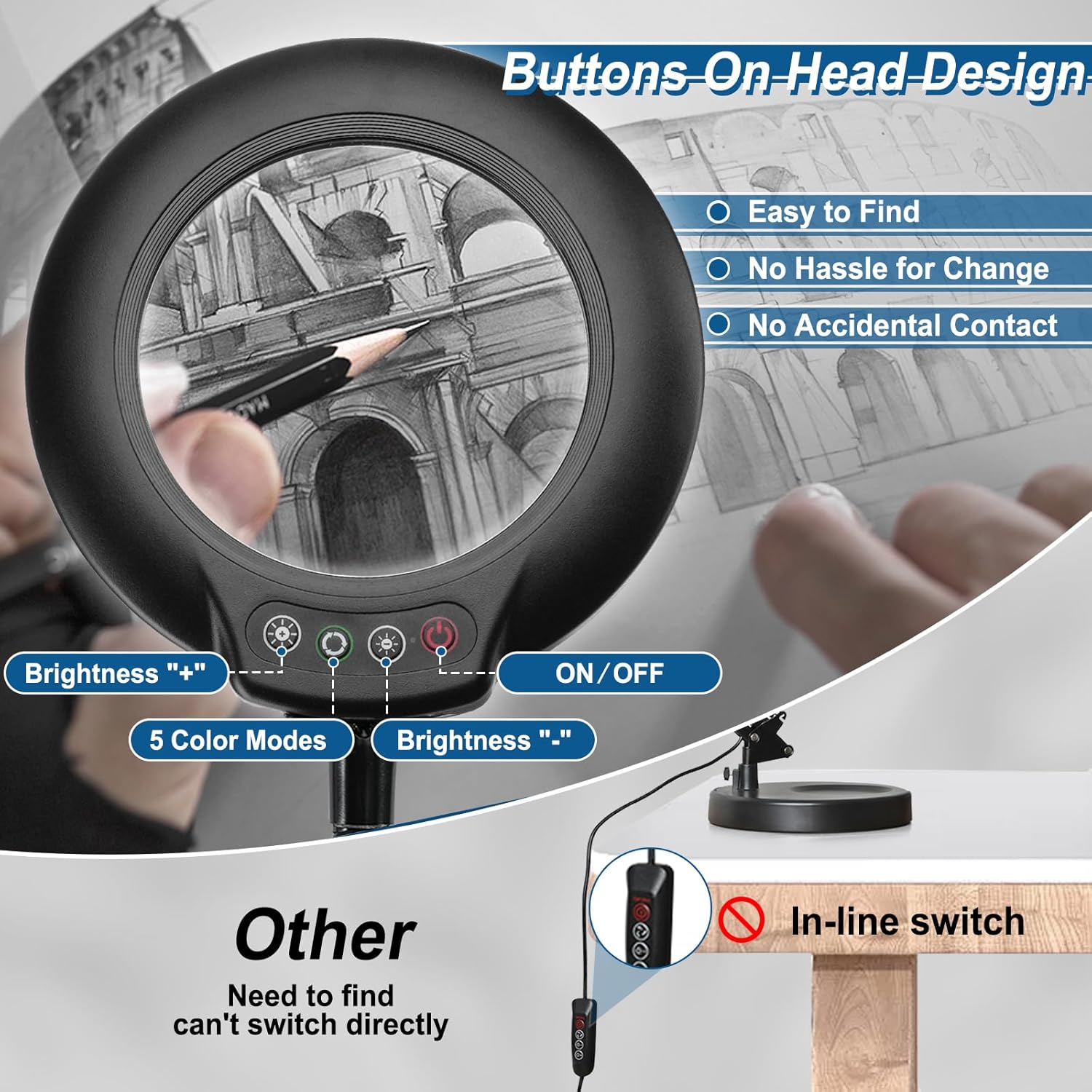 Conveniently located buttons on the head of the magnifying light provide easy adjustment of lighting settings without bending over, enhancing user convenience during detailed tasks like sewing and painting.