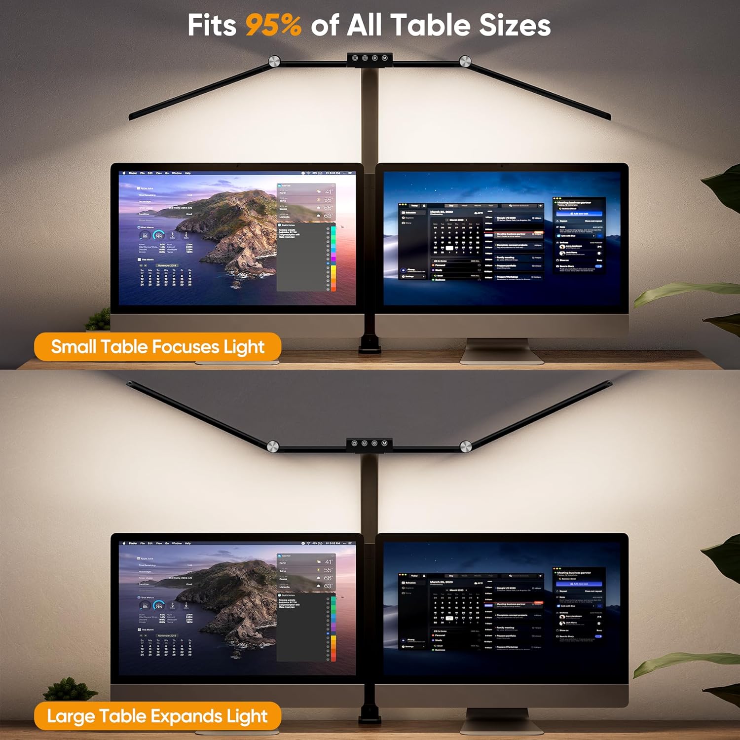 Ultra wide desk lamp with stepless dimming, adjustable height, and eye protection. Perfect for workspaces with dual monitors!