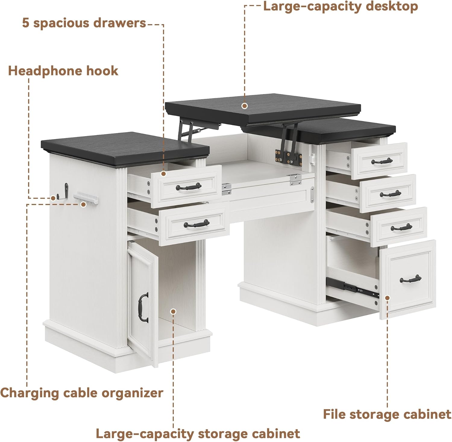 Specification: Farmhouse 57″ Lift Desktop Executive Desk with 6 Drawers and Charging Station, Wood Home Office Computer Desk with File Cabinet Storage, Keyboard Tray,Headphone hook for Work,Study, Antique White