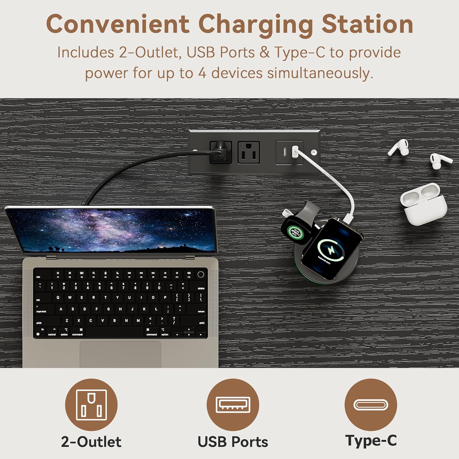 The desk also includes a spacious, slide-out keyboard tray that reduces wrist strain and frees up valuable desktop space. Additionally, a built-in charging station with USB and Type-C ports makes managing cables and devices a breeze.