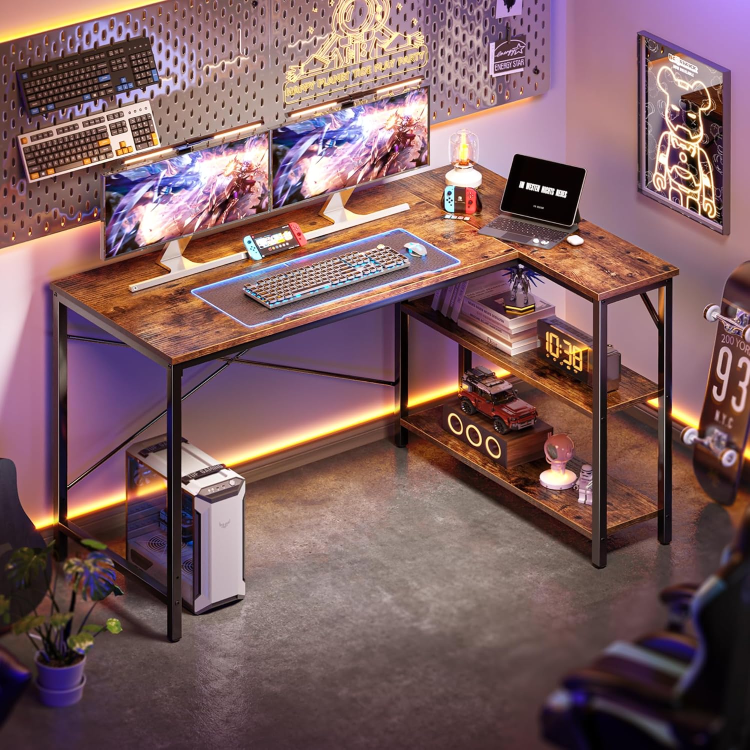 Specification: Huuger 47 Inches L Shaped Desk, Computer Desk with Reversible Storage Shelves, for Gaming Corner Home Office Writing Study, Metal Frame, Rustic Brown