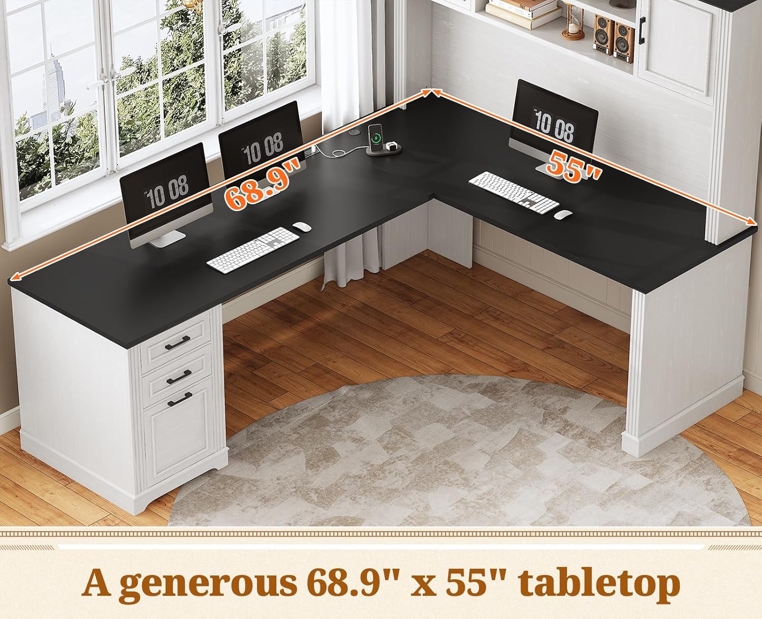 Specification: SEDETA Farmhouse L Shaped Desk with Hutch and 3 Drawers, 68.9″ Executive Office Desk with File Drawer and Power Outlet, Corner Computer Desk with Storage Shelves for Home Office, White
