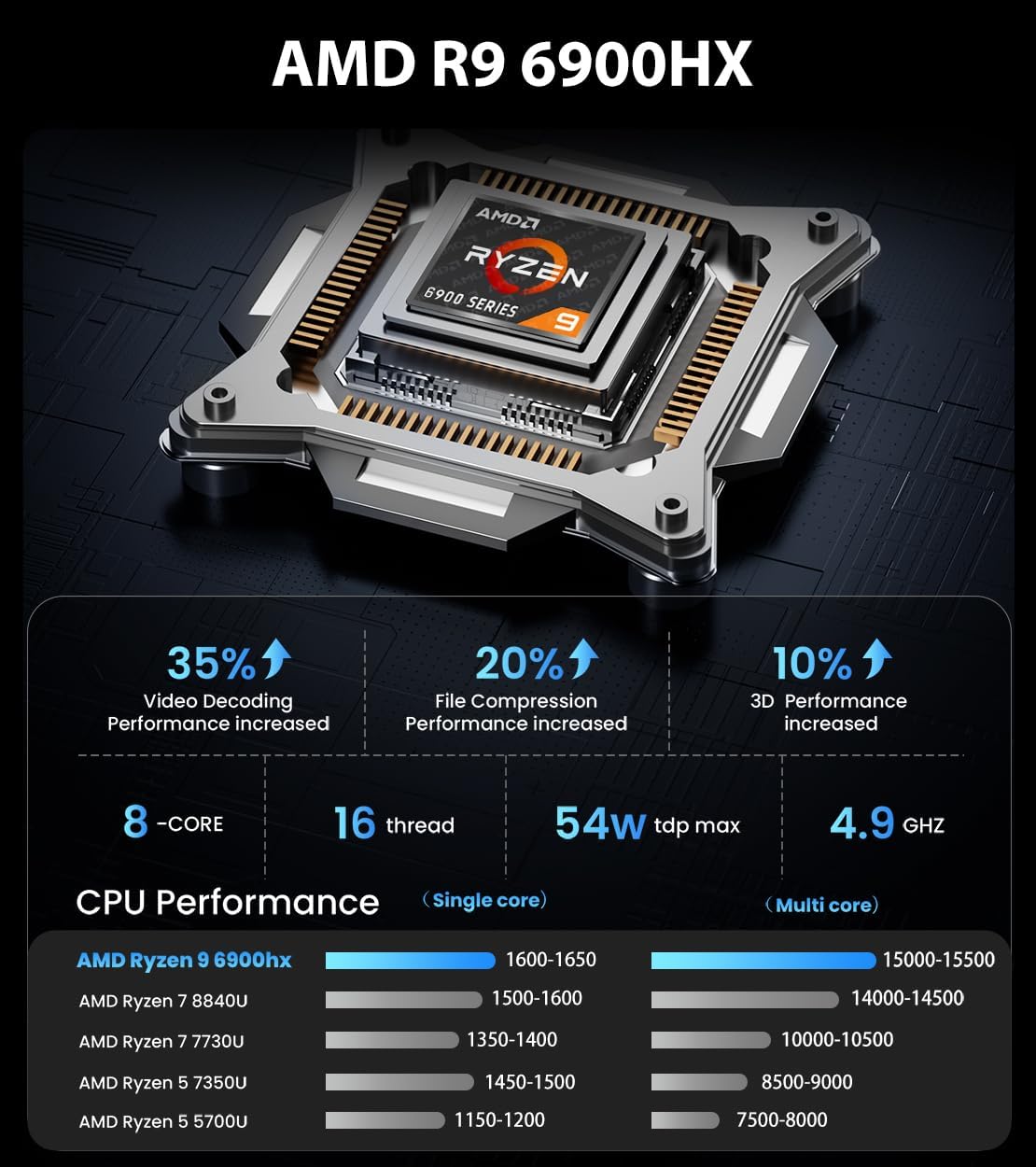 - High-Performance CPU: Equipped with an AMD R9 6900HX featuring an 8-core, 16-thread design for seamless multitasking and demanding applications.
