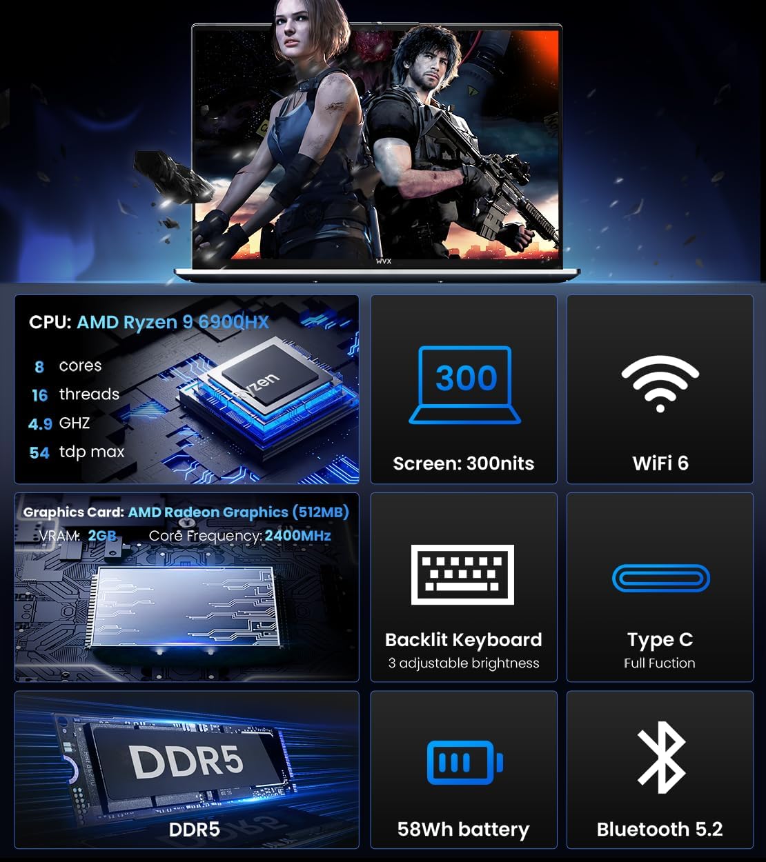 Specification: Gaming Laptop AMD Ryzen 9 6900HX (4.9Ghz 8C 16T) Graphics AMD Radeon 680M (>1050Ti) 16 Inch FHD Computer 16GB RAM 512GB SSD WiFi 6 Bluetooth 5.2 DDR5 58Wh Battery