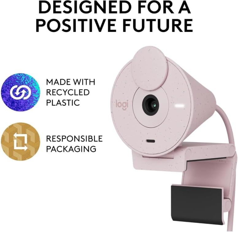 The Logitech Brio 300 is crafted with a minimum of 48% post-consumer recycled plastic, promoting a more sustainable future.