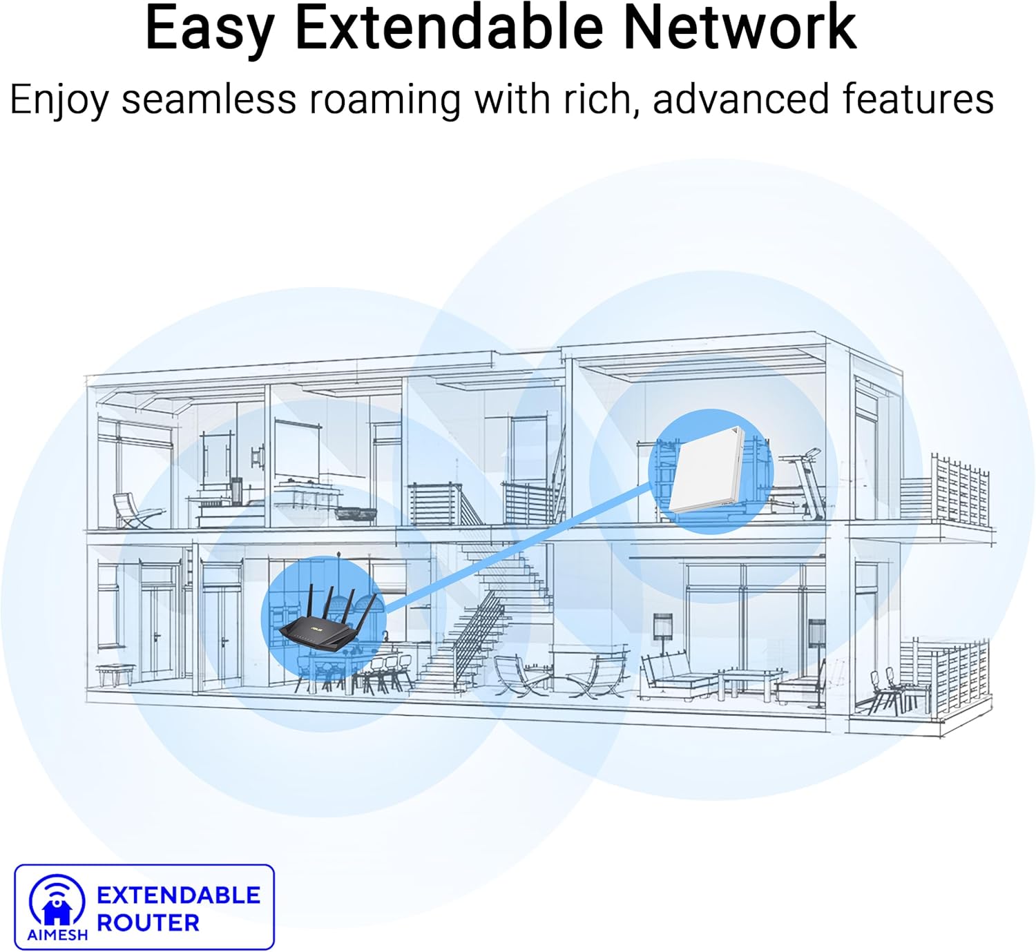 Enjoy seamless roaming throughout your home with the AiMesh extendable router feature, which allows for rich, advanced networking capabilities, ensuring robust coverage in every corner of your space.