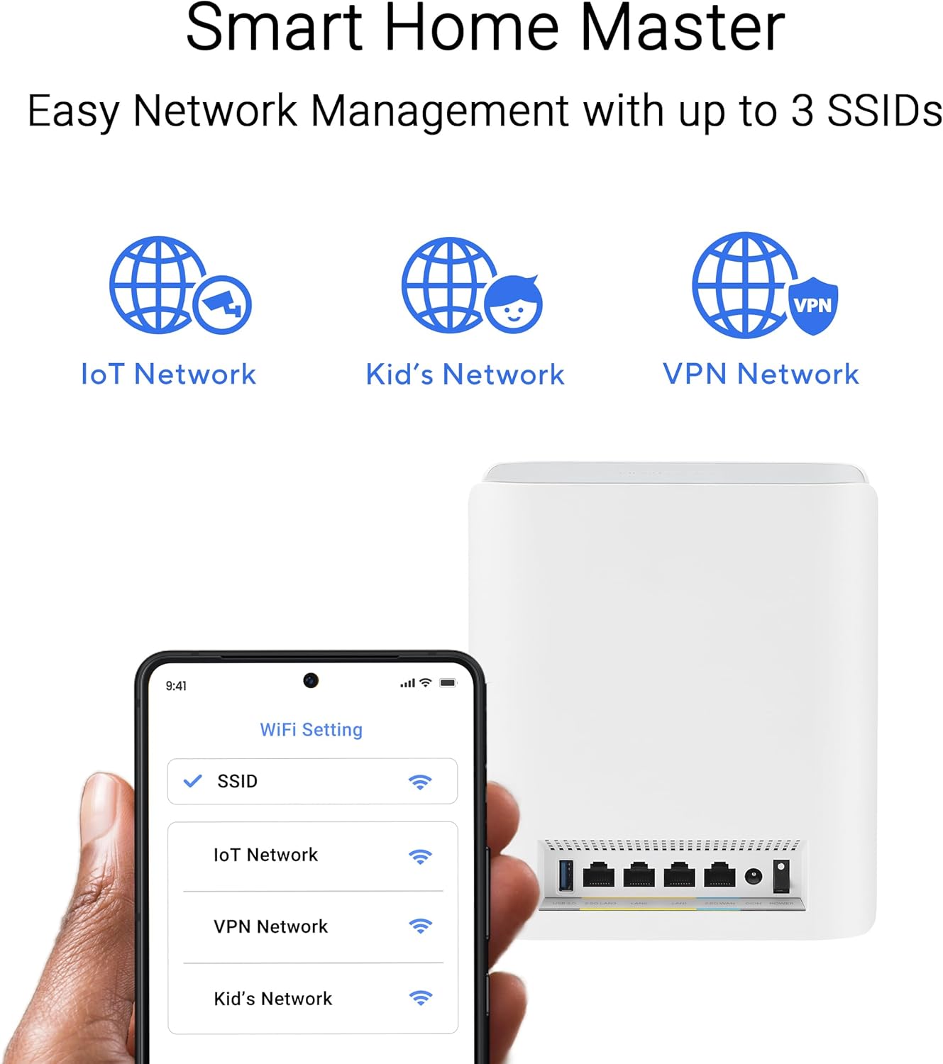 - Easy setup for IoT networks, parental controls, and VPN on multiple devices with Smart Home Master SSIDs.
